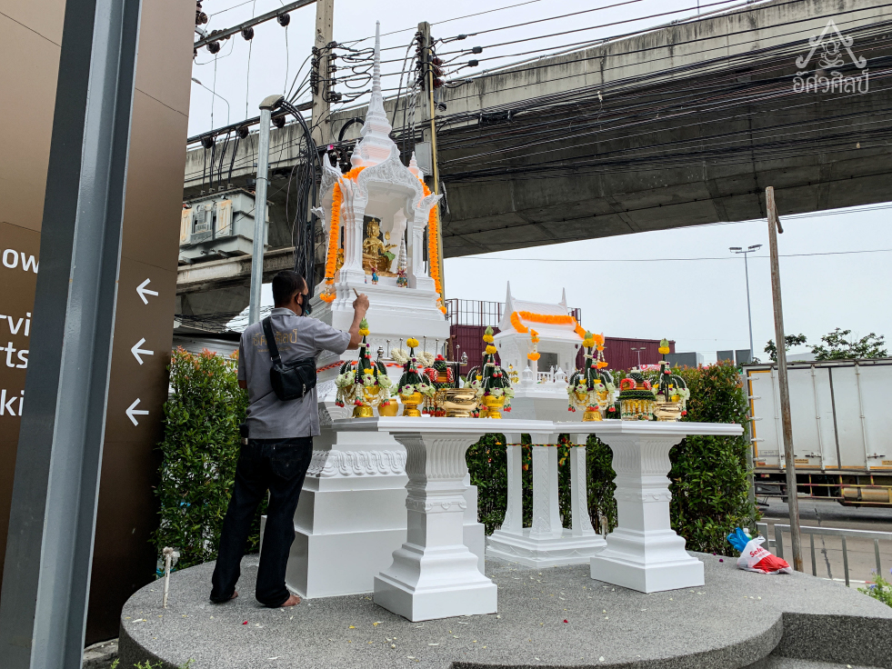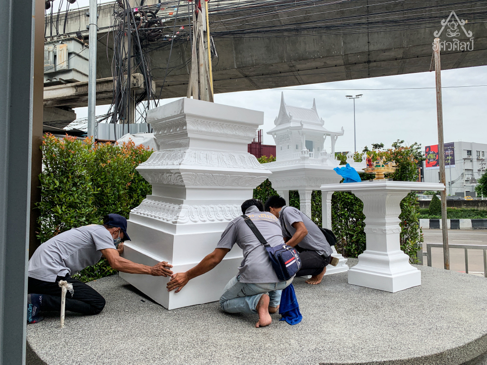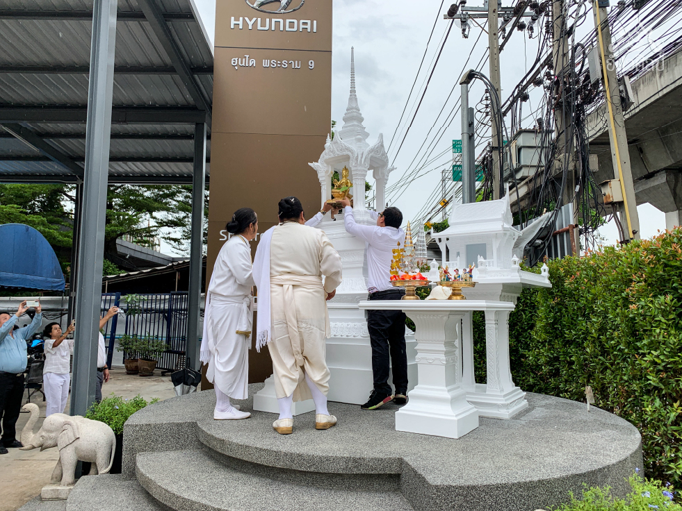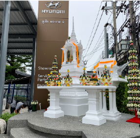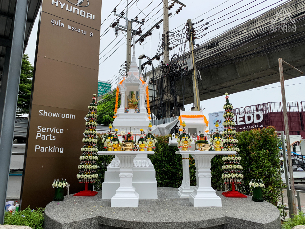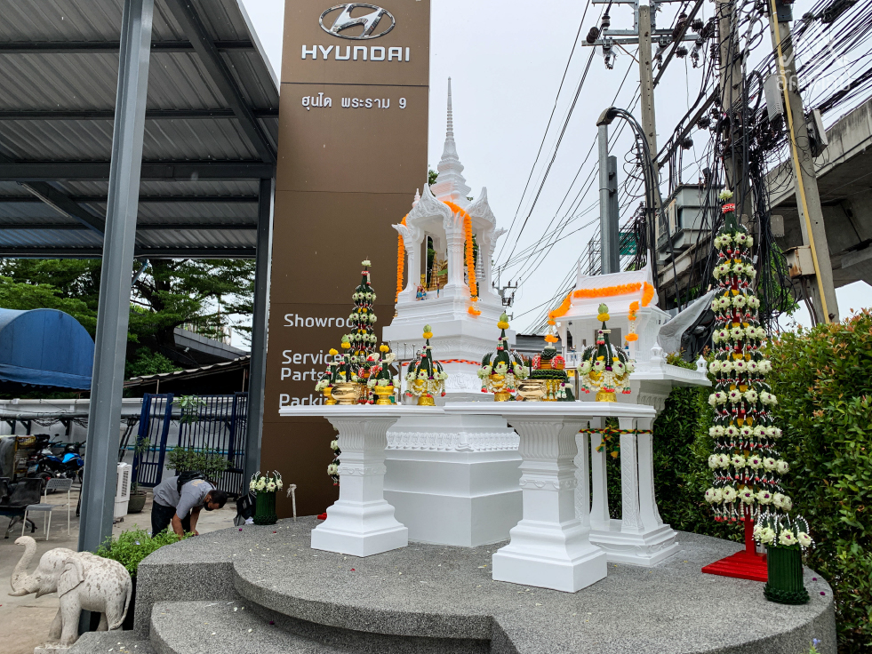 ศาลพระพรหมทรงไทยรุ่นวิมานเมฆยอดเจดีย์และศาลเจ้าที่ตายายทรงไทยรุ่นมั่งมีศรีสุข (งานสีอะคริลิค,ขาวล้วน) ผลงานติดตั้งศาลที่โชว์รูมฮุนได สาขาพระราม9 Hyundai Rama9